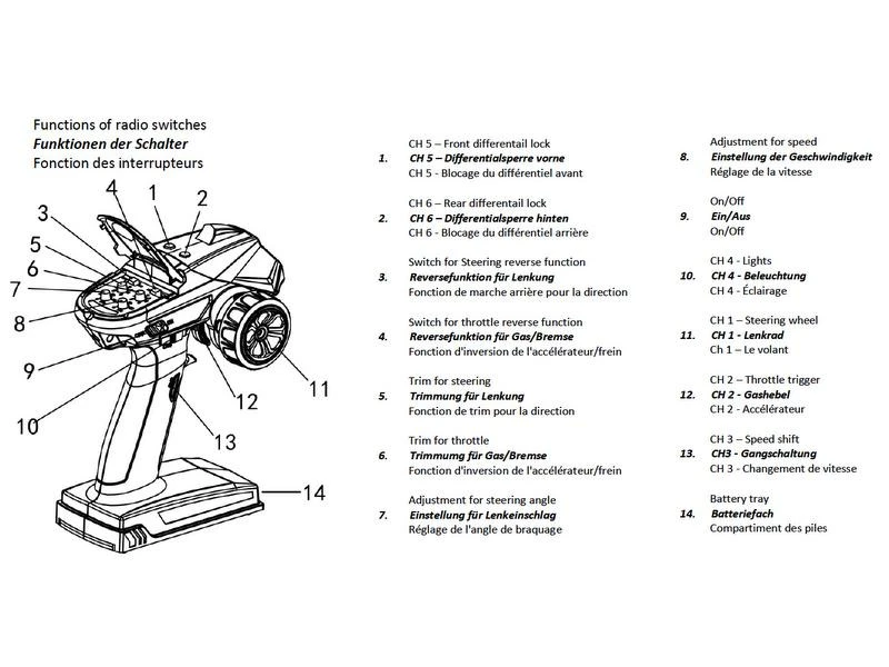 - 2x 2-Pos Schalter oben auf dem Sender (Differenzialsperren vorne / hinten)