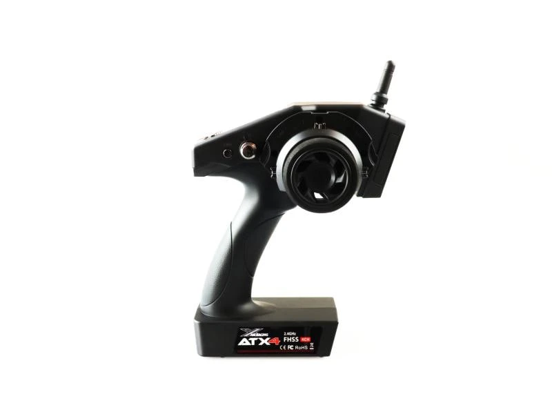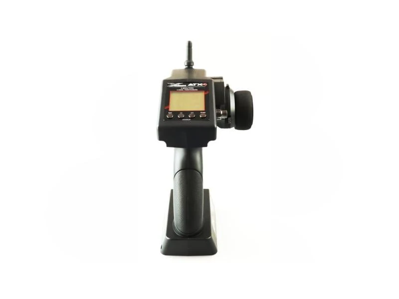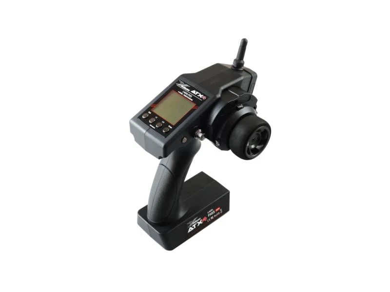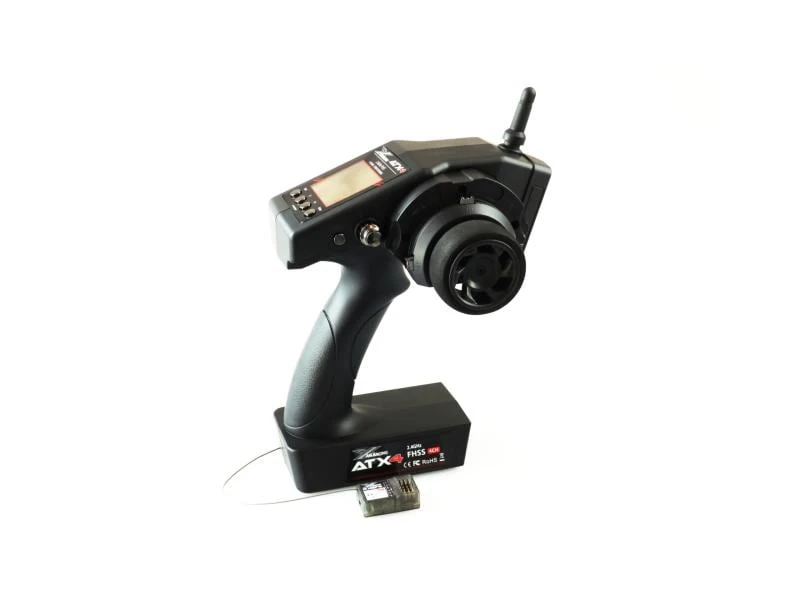 Die ATX4 ist ein 2.4-GHz-Pistolensender mit 4 vollwertigen Kanälen für Einsteiger. Der Sender verfügt über einen hintergrundbeleuchteten Bildschirm, welcher ein benutzerfreundliches Menü in deutscher oder englischer Sprache anzeigt. Sie können bis zu 10 verschiedene Modelle abspeichern und viele Einstellungsmöglichkeiten wie z.B. für Expo, Dual Rate, Bremse, ABS, Gyro, Aux-Kanal und Mixer vornehmen. Das System ist wassergeschützt und überzeugt zudem mit einer schnellen Reaktionszeit von 12 ms sowie einer Reichweite von bis zu 400 m.