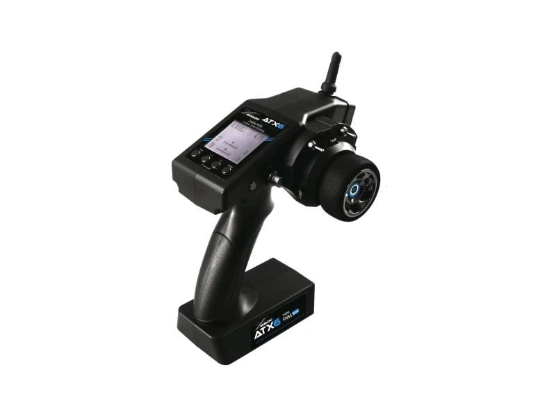 Die ATX6 ist ein 2.4-GHz-Pistolensender mit 6 vollwertigen Kanälen für Einsteiger. Der Sender verfügt über einen hintergrundbeleuchteten Bildschirm, welcher ein benutzerfreundliches Menü in deutscher oder englischer Sprache anzeigt. Sie können bis zu 10 verschiedene Modelle abspeichern und viele Einstellungsmöglichkeiten wie z.B. für Expo, Dual Rate, Bremse, ABS, Gyro, Aux-Kanal und Mixer vornehmen. Ebenfalls ist der Sender noch mit zwei 3-Wege-Schaltern als Kanal 5+6 für Zusatzfunktionen wie beispielsweise Seilwinde, Beleuchtung oder Sound ausgestattet. Das System ist wassergeschützt und überzeugt zudem mit einer schnellen Reaktionszeit von 12 ms sowie einer Reichweite von bis zu 600 m.