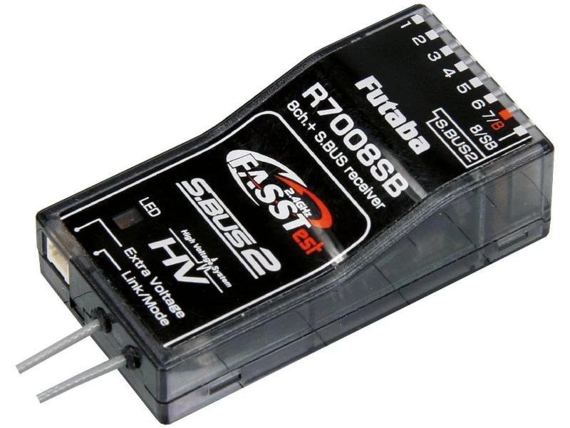 Der R7008SB ist ein 2,4GHz FASSTest S.BUS-Empfänger mit voller Reichweite und integriertem Telemetriesender. Er ist einsetzbar vom Mini-Heli bis zum Grossflugmodell. Die Ausgänge der 8 PWM-Servokanäle sind den Ausgängen Port 1 und 2 zuteilbar, wodurch Ausgangsbelegung weitgehend frei gewählt werden kann.