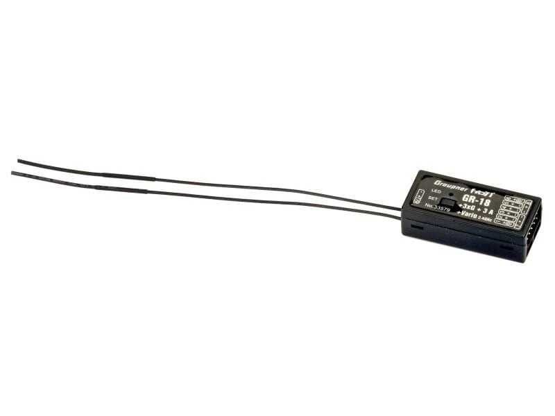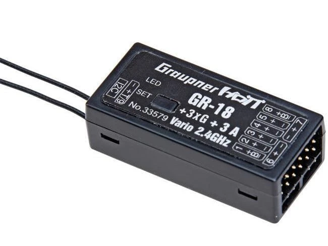 Der Graupner GR-18 HoTT 3xG Vario ist ein Empfänger mit 9 Kanälen für Flugzeuge und Helikopter. Mit der HoTT-Technologie verfügt er über ein neues Hopping Telemetry Transmission Hochfrequenzteil mit modernsten Komponenten und modernster Software. Ein Hardware-Antennendiversity für optimalen Empfang. Ohne Zusatz-Sensorik werden die Parameter Empfängerspannung und -Temperatur sowie Signalstärke und Höhe übermittelt.
