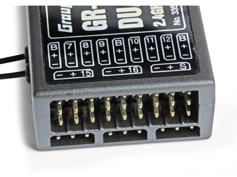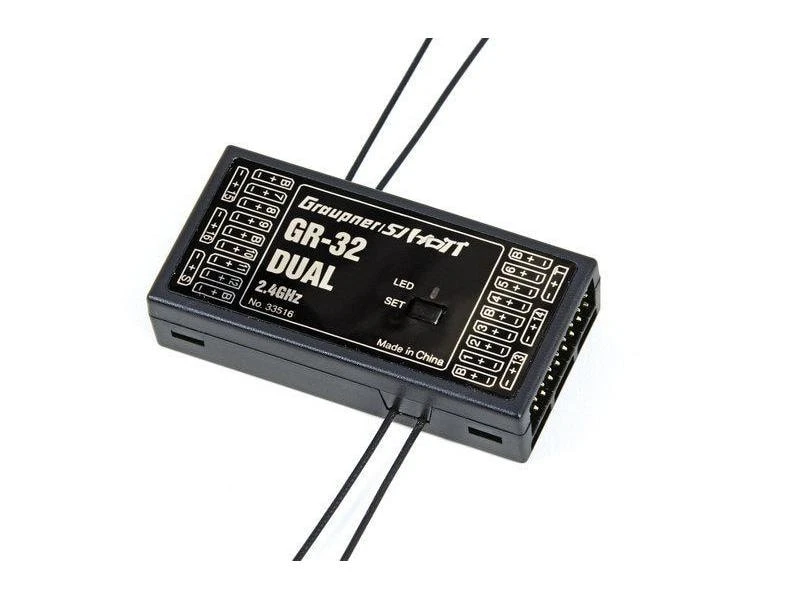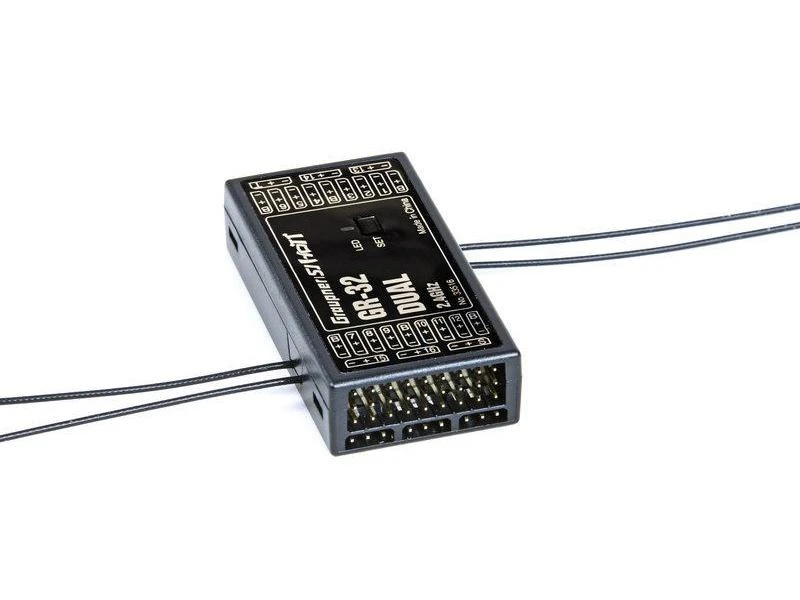 Der Graupner GR-32 Dual Empfänger verfügt über eine HoTT 2,4-GHz-Technologie und kann bis zu 16 Servos ansteuern. Zudem ist ein Hopping Telemetry Transmission Hochfrequenzteil mit modernen Komponenten und Software integriert. Der GR-32 hat zwei komplette Empfangsteile und eine zusätzliche Hardware-Antennendiversität. Daher schaltet der Empfänger immer auf das bessere Antennensignal und verwendet zum Senden immer die Antenne, welche zuletzt zum Empfangen benutzt wurde. Somit ist sichergestellt, dass die Rückkanal-Daten über die besser positionierte Antenne gesendet werden. Ohne zusätzliche Sensorik übermittelt das Gerät die Parameter Empfängerspannung und Temperatur sowie Signalstärke. Ausserdem hat der Empfänger einen Anschluss für Telemetriesensoren und Summensignal Ein- oder Ausgang.