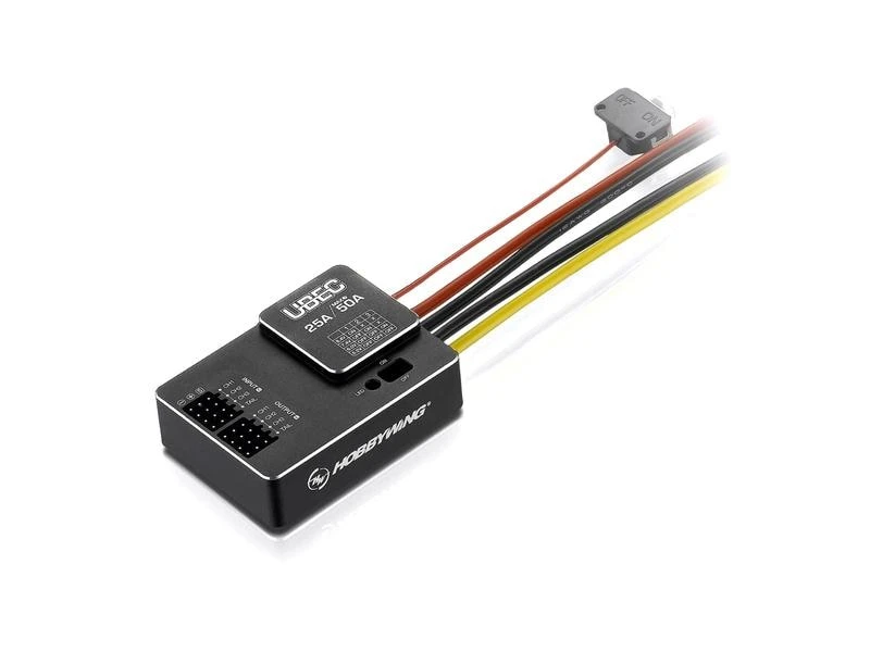 Mit dem Hobbywing UBEC 25A HV versorgen Sie ihre Empfangsanlage sicher und effizient mit Strom aus einem angeschlossenen LiPo Akku von 3 – 18 s. Ein grosser Vorteil des Hobbywing UBEC ist die Auswahlmöglichkeit der Ausgangsspannung an die verwendeten Servos. Diese ist einstellbar in vier Stufen von 5.2 V bis zu 8.4 V. Für optimale Sicherheit der Stromversorgung besteht die Möglichkeit zum Anschluss eines externen, zusätzlichen Backup Akkus. Dieser übernimmt die automatisch die Versorgung wenn der Hauptakku leer oder defekt sein sollte. Zum Einsatz kommt dieser leistungsfähige UBEC in grossen Helikoptern und Flächenmodellen mit entsprechend leistungsstarken Servos und entsprechender Anzahl.