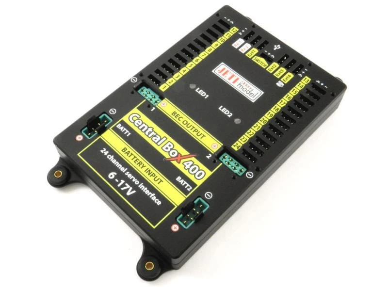 - Bis zu 24 Servoausgänge (mit Überlastschutz) einzeln programmierbar und 2 Akku-Eingänge (MPX) zur Stromversorgung der Empfangsanlage über zwei starke, integrierte BECs