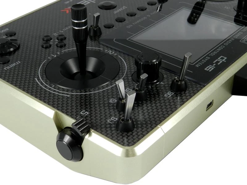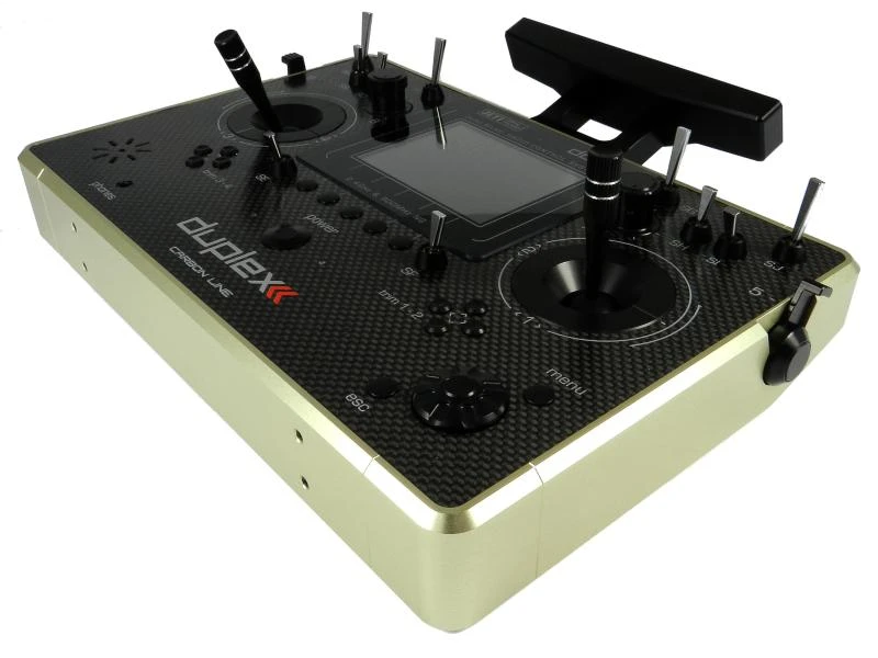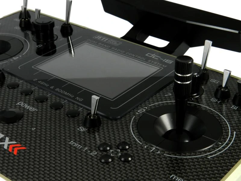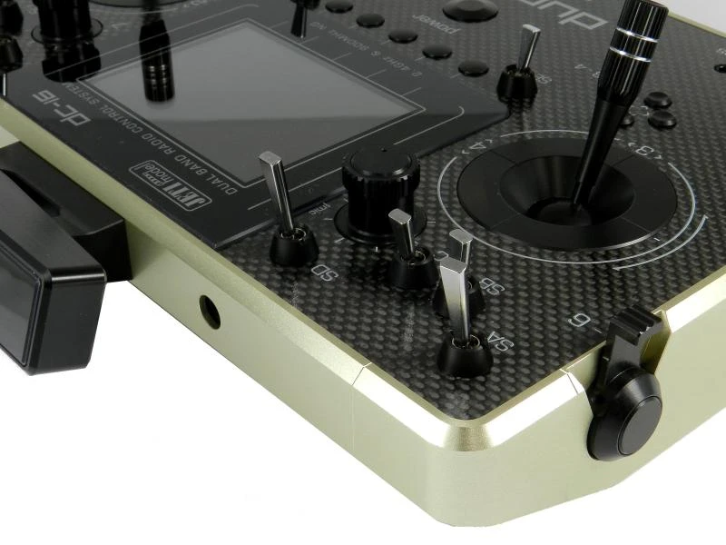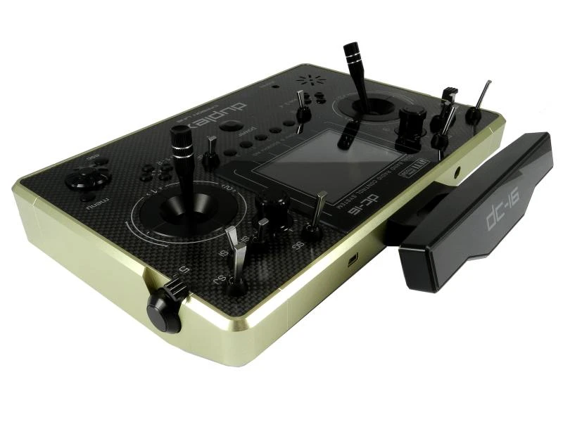 Die Jeti DC-16 II ist ein 24-Kanal-Pultsender für erfahrene RC Flugpiloten. Sie überzeigt mit ihrem grossen Funktionsumfang und der hochwertigen Verarbeitung, wozu beispielweise ein Metallgehäuse sowie aus Aluminium gefertigte Steuerknüppel gehören. Im Vergleich zur normalen DC-16 II Multimode besitzt diese Ausführung eine stylische Oberfläche aus Carbon.