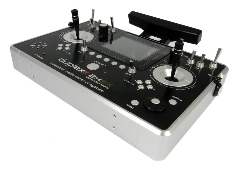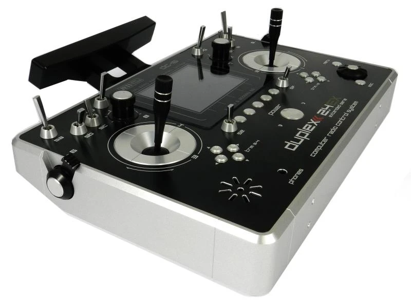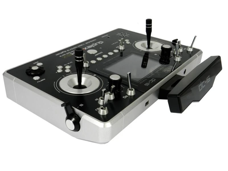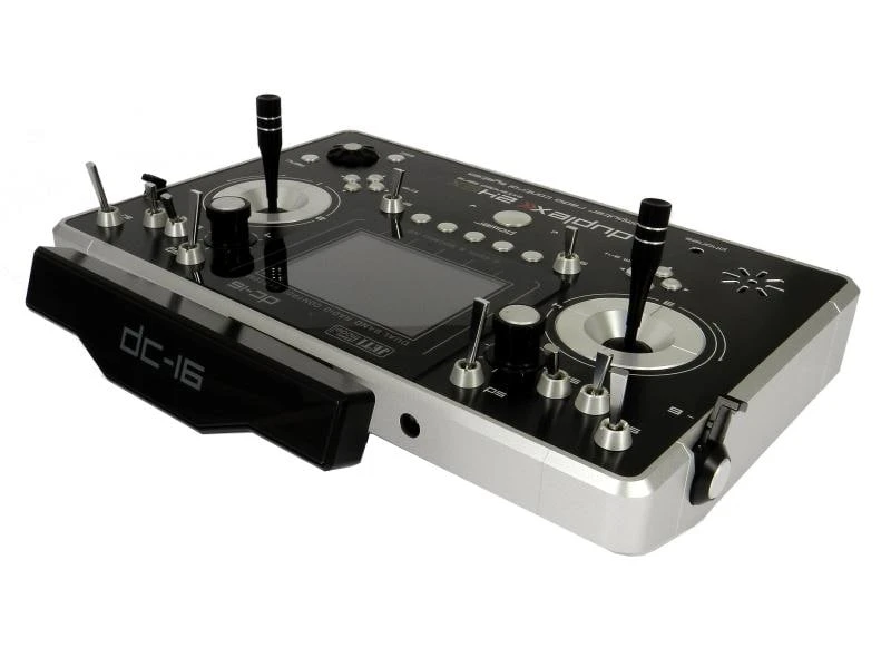 Die Jeti DC-16 II ist ein 24-Kanal-Pultsender für erfahrene RC Flugpiloten. Sie überzeigt mit ihrem grossen Funktionsumfang und der hochwertigen Verarbeitung, wozu beispielweise ein Metallgehäuse sowie aus Aluminium gefertigte Steuerknüppel gehören.