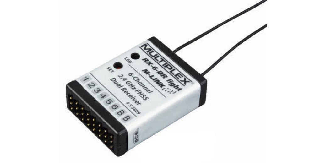 Der Multiplex RX-6-DR light ist ein kleiner aber robuster 6-Kanal-Empfänger mit Multiplex-2,4-GHz-M-LINK-Technologie. Dank seines Dual-Recievers verfügt er über zwei parallel arbeitende Empfangszweige, was für sehr gute Empfangsqualität sorgt. Durch seine kompakte Bauweise und sein geringes Gewicht eignet er sich besonders für kleinere Modelle. Die Inline-Steckeranordnung unterstützt eine einfache Montage.