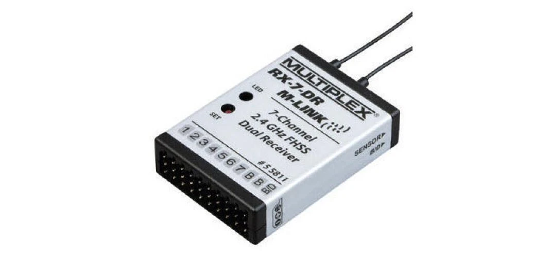 Der Multiplex RX-7-DR ist ein hochwertiger, in modernster SMD-Technik gefertigter, 7-Kanal-Empfänger mit Multiplex-2,4-GHz-M-LINK-Technologie. Dank seines Dual-Recievers verfügt er über zwei parallel arbeitende Empfangszweige, was für sehr gute Empfangsqualität sorgt. Durch seine kompakte Bauweise und sein geringes Gewicht eignet er sich besonders für kleinere Modelle. Die Inline-Steckeranordnung unterstützt eine einfache Montage.