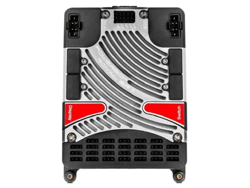 Die PowerBox Royal SR2 ist in ein äusserst kompaktes und edles Gehäuse mit Aluminiumkühlkörper eingebaut. Die grosse Kühlfläche transportiert die Wärme der 4 Regler ab, die paarweise die Energie für alle 26 Servos bereitstellen. Beide Reglerpaare können auf 4 unterschiedliche Spannungen eingestellt werden. Damit können Standard 6 V Servos mit leistungsfähigen HV-Servos ohne zusätzliche Reglerbausteine kombiniert werden.