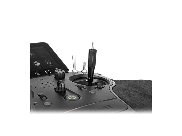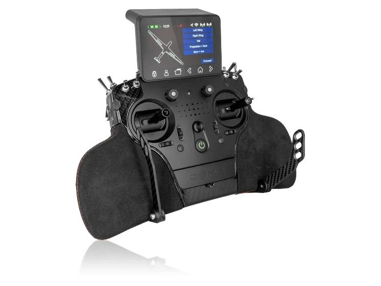 Nimmt man den CORE in die Hand, fühlt man sich sofort zu Hause: Alle Schalter sind so angeordnet, wie man es bei einem High-end-System erwartet. Dem Piloten wird ein professionelles «Werkzeug» in die Hand gegeben, mit dem er sofort umgehen kann. Die abnehmbaren, mit Alcantara bezogenen Griffstücke, sehen nicht nur edel aus, sie sorgen auch zu jeder Jahreszeit für ein angenehmes Gefühl an den Händen. Dazu ist der Schwerpunkt des Senders perfekt ausbalanciert.