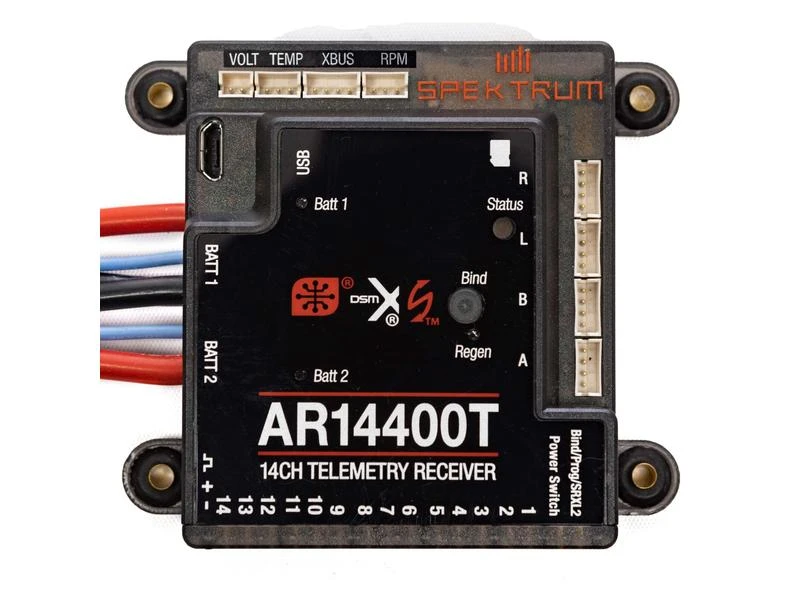 Der Spektrum AR14400T PowerSafe Empfänger ist ein mit Features vollgepackter 14-Kanal-Empfänger mit integrierter Full-Range Telemetrie. Spektrum PowerSafe-Empfänger sind für Modelle mit zahlreichen Servos und Zubehör konzipiert, welche hohe Ansprüche an die Stromversorgung stellen wie es bei Grossmodellen und Jets oftmals der Fall ist. Sie verfügen über einen robusten Strom-Bus, der für hohe Ströme ausgelegt ist, sowie über zwei Akku-Eingänge mit 13AWG Kabel und IC3-Anschlüssen für die Verwendung mit grösseren Akkupacks. Dadurch ist es möglich, Hochstromsysteme direkt von dem Empfänger aus mit Strom zu versorgen, ohne dass eine separate Stromversorgung erforderlich ist.
